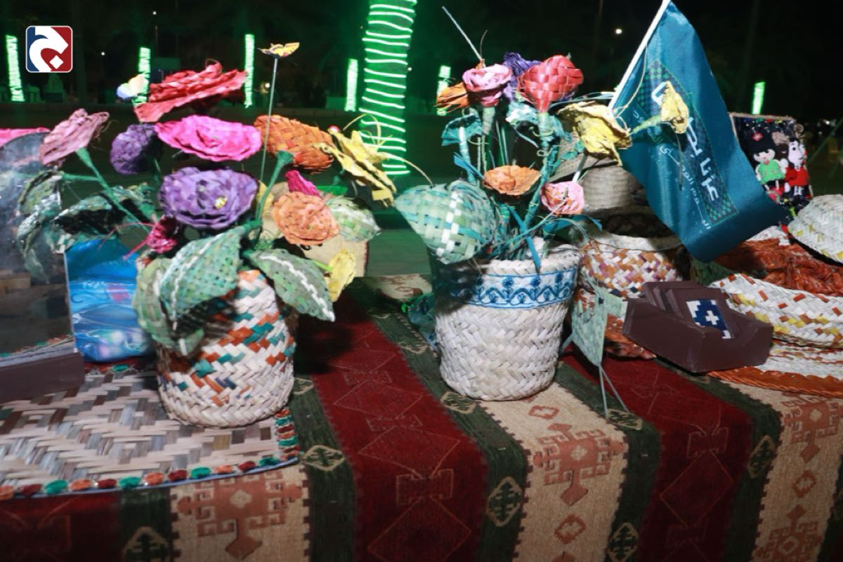 وعرضت الحرفية خلال المهرجان مجموعة من الأعمال التي تمزج بين الوظيفة والجمال، أبرزها مزهريات مصنوعة ببراعة من السعف والخوص الملون بأشكال هندسية مبتكرة، إضافة إلى ”سفرة الطعام“ التي عكست مستوى عالياً من الدقة الفنية والتجديد في التصميم.