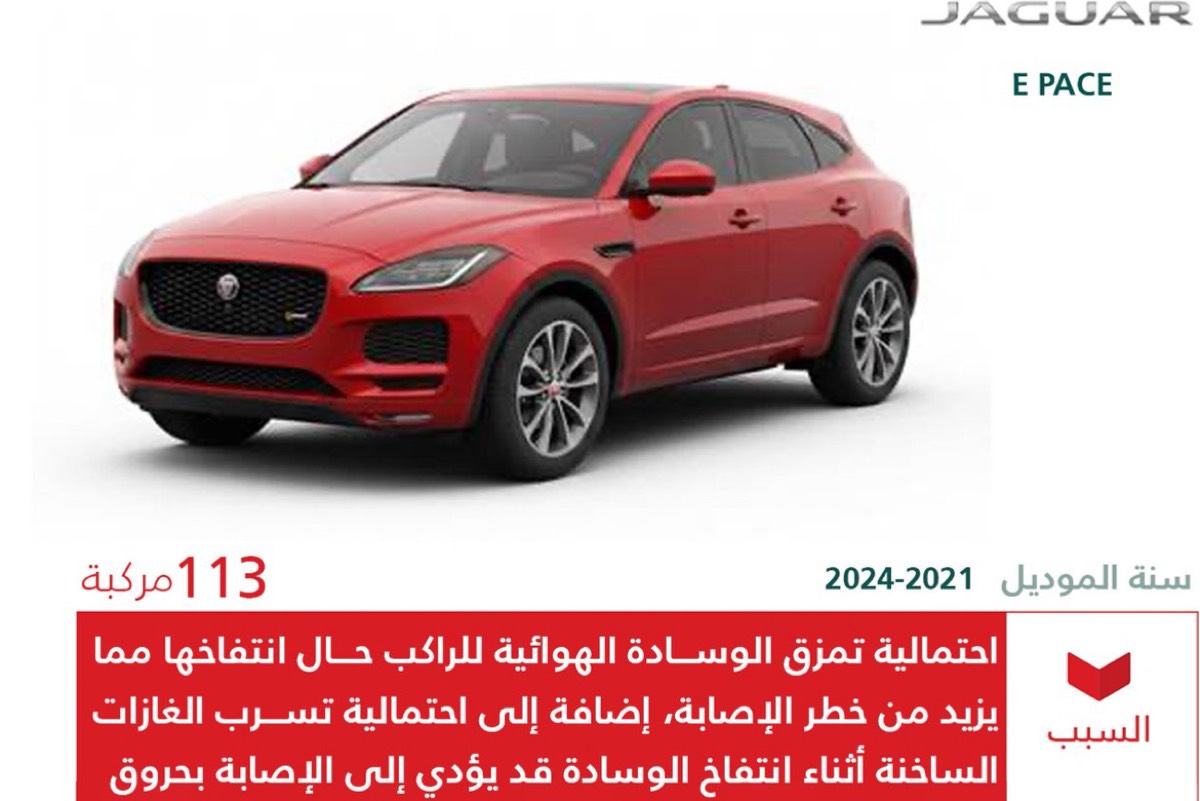حذرت وزارة التجارة مالكي سيارات «جاكوار» من طراز ”E-PACE“، معلنة عن استدعاء 113 مركبة مصنعة بين عامي 2021 و 2024.