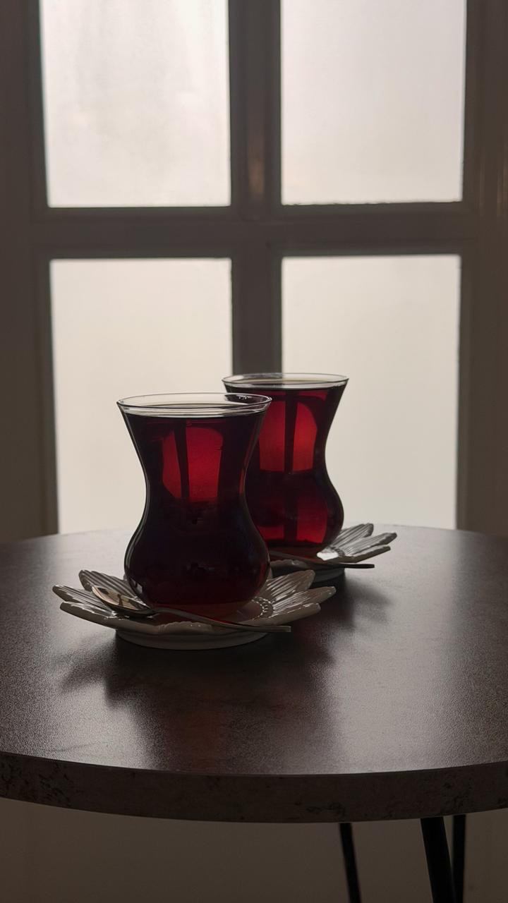 ورسم الشاعر يوسف الشعلة لوحة حسية متكاملة، مشبهاً كؤوس الشاي بنجمات تضيء الأفق، ولافتاً إلى أن حمرتها تتفوق في سحرها على تورد الخدود في قصائد الغزل.