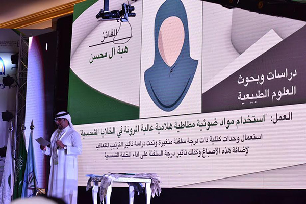 وفي مجال البحوث والدراسات - دراسات وبحوث علوم طبيعية - هبة عبد الله أحمد آل محسن عن العمل ”إستخدام مواد ضوئية مطاطية هلامية عالية المرونة في الخلايا الشمسية“.