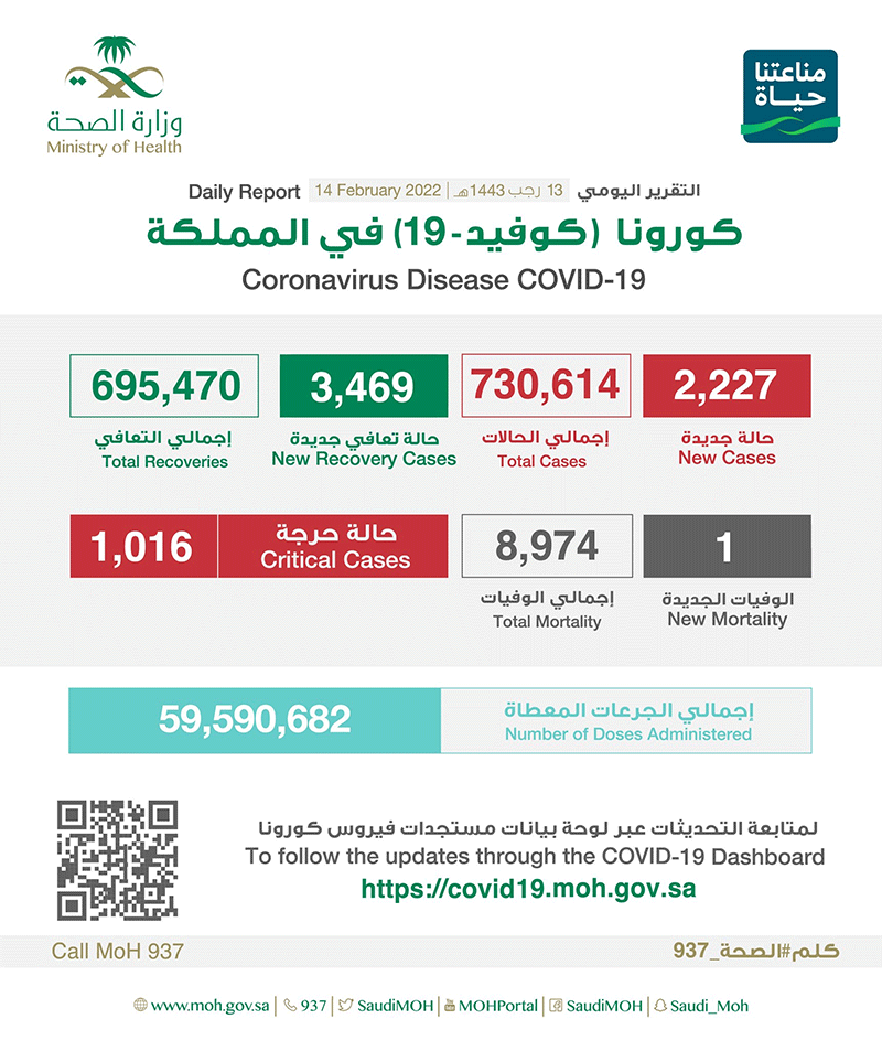 «الصحة»: تسجيل 2227 إصابة جديدة ب «كورونا».. ”15“ بالقطيف و”9“ بصفوى و”9“ بسيهات