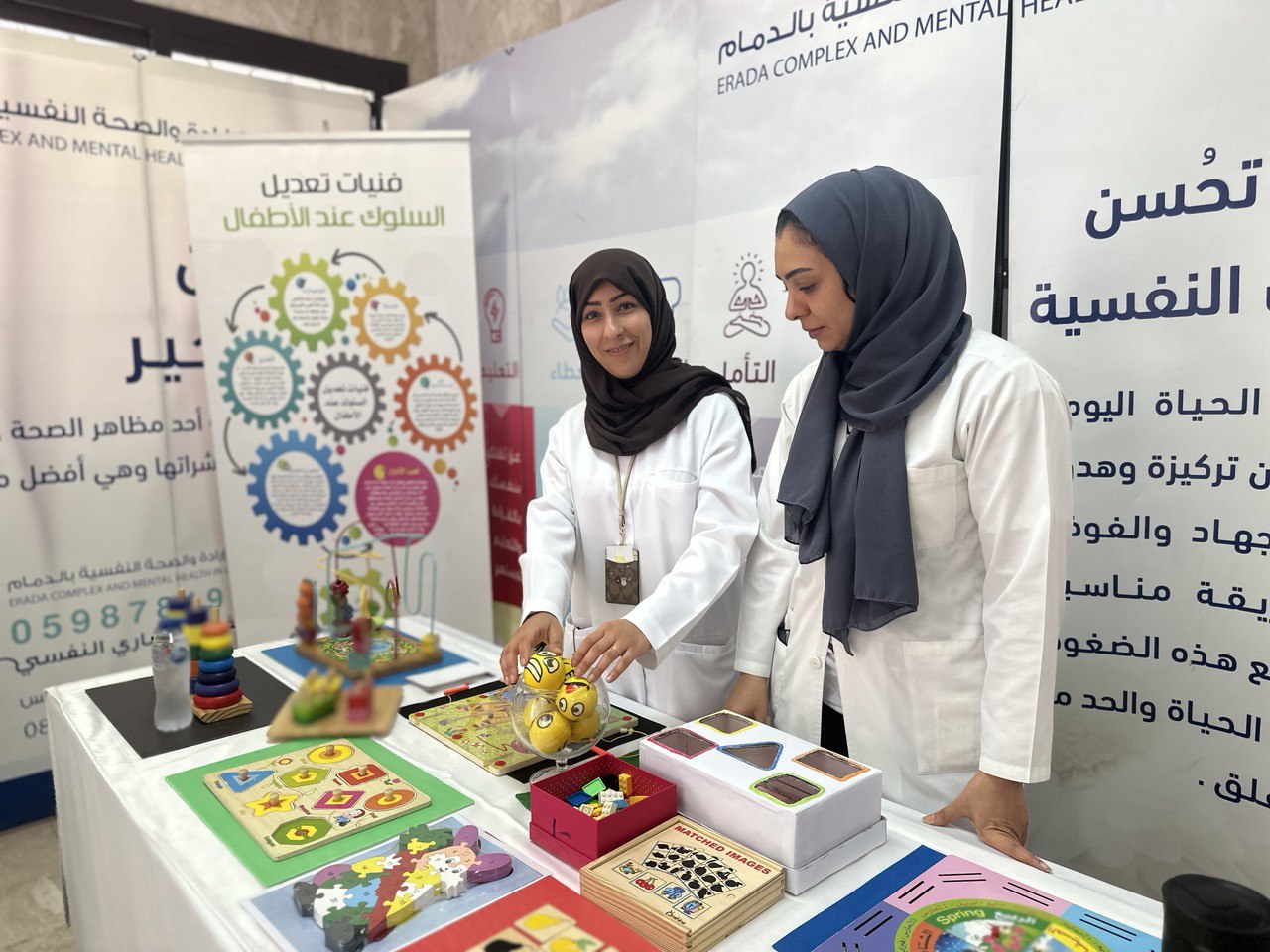 وقدمت كل من أخصائيتي النطق والتخاطب مريم حسين وسارة الزهراني ورشة عمل بعنوان ”اضطرابات اللغة والنطق عند الأطفال“، فيما تحدثت الأخصائية النفسية نورة المالكي عن ”العلاج السلوكي للتوحد“.