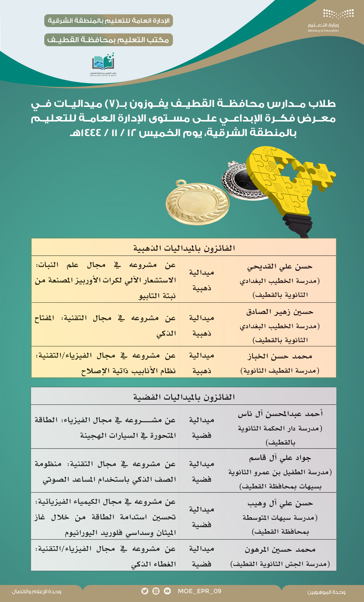 ‏تمكن طلاب مدارس محافظة القطيف من حصد 7 ميداليات ذهبية وفضية، في معرض ”فكرة“ الإبداعي 2023 من بين 60 مشروعاً علميًا مشاركًا والذي نظمته إدارة الموهوبين «بنين» على مستوى الإدارة العامة للتعليم بالمنطقة الشرقية في نسخته الخامسة.